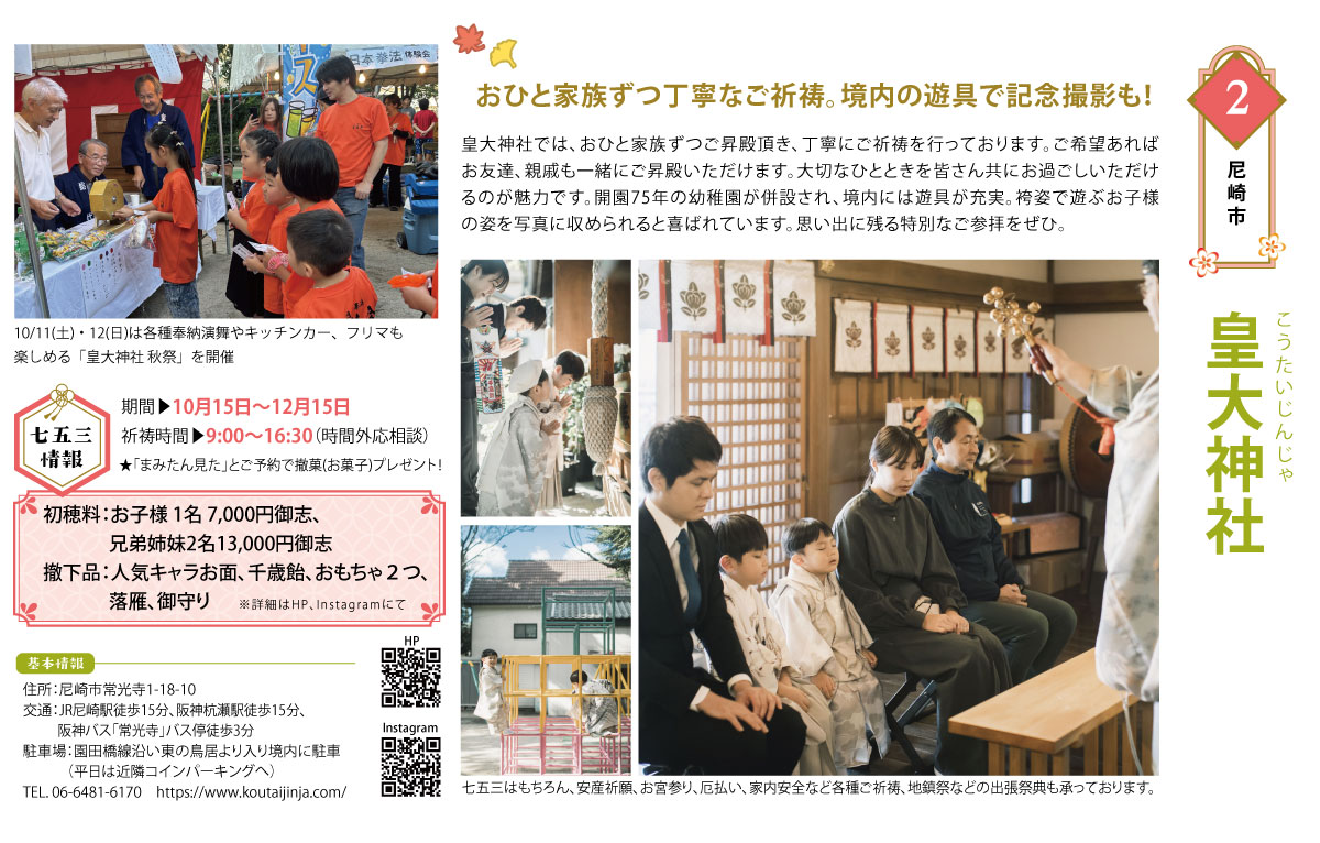 2025.9.10 おひと家族ずつ丁寧なご祈祷。境内の遊具で記念撮影も!【皇大神社】 シェア ツイート お気に入り追加 0 皇大神社では、おひと家族ずつご昇殿頂き、丁寧にご祈祷を行っております。ご希望あればお友達、親戚も一緒にご昇殿いただけます。大切なひとときを皆さん共にお過ごしいただけるのが魅力です。開園75年の幼稚園が併設され、境内には遊具が充実。袴姿で遊ぶお子様の姿を写真に収められると喜ばれています。思い出に残る特別なご参拝をぜひ。 皇大神社 皇大神社|HP 子供の成長を祝おう!七五三特集TOP 5 件 シェア ツイート お気に入り追加 0 関連記事 2025.09.10 家族の絆を彩る特別な1日を過ごそう|七五三で素敵な思い出づくり まみたん編集部 2025.09.10 家族の絆を彩る特別な1日を過ごそう|七五三の衣装 まみたん編集部 2017.09.22 大切な日を記念に残そう!七五三&ハロウィンでママもカメラを実践! まみたん編集部 2025.09.29 まみたん阪神版『表紙写真』『誕生日写真』大募集!【0~6歳限定】キッズフォトを募集中です! まみたん阪神編集部 2025.09.29 まみたん阪神版『表紙写真』『誕生日写真』大募集!【0~6歳限定】まみたんブックの表紙を飾ってくれるキッズフォトを募集中です! まみたん阪神編集部