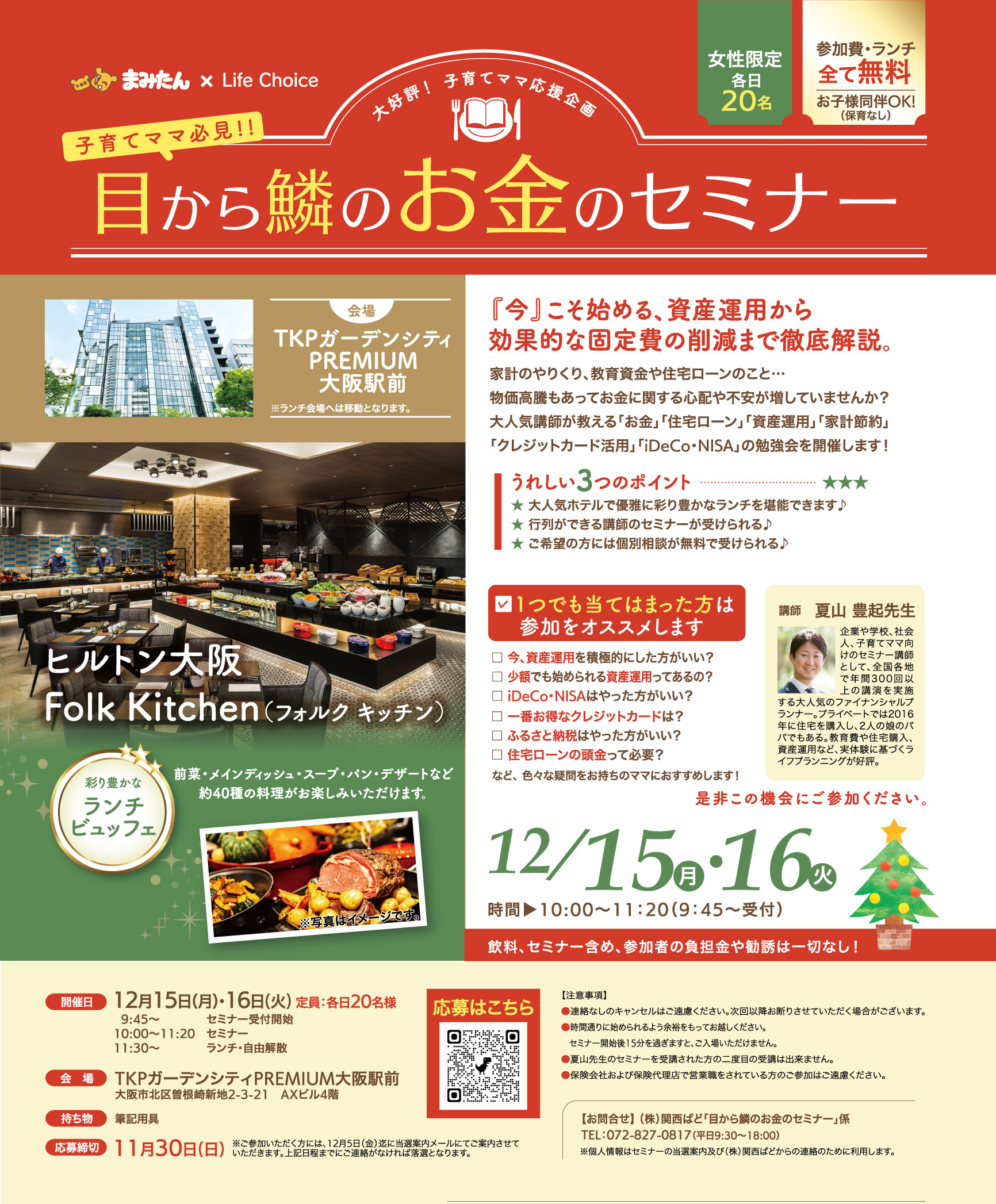 12/15(月)・16(火) 開催!子育てママ必見!!「目から鱗のお金のセミナー」(ランチ付・参加費無料)/TKPガーデンシティPREMIUM大阪駅前