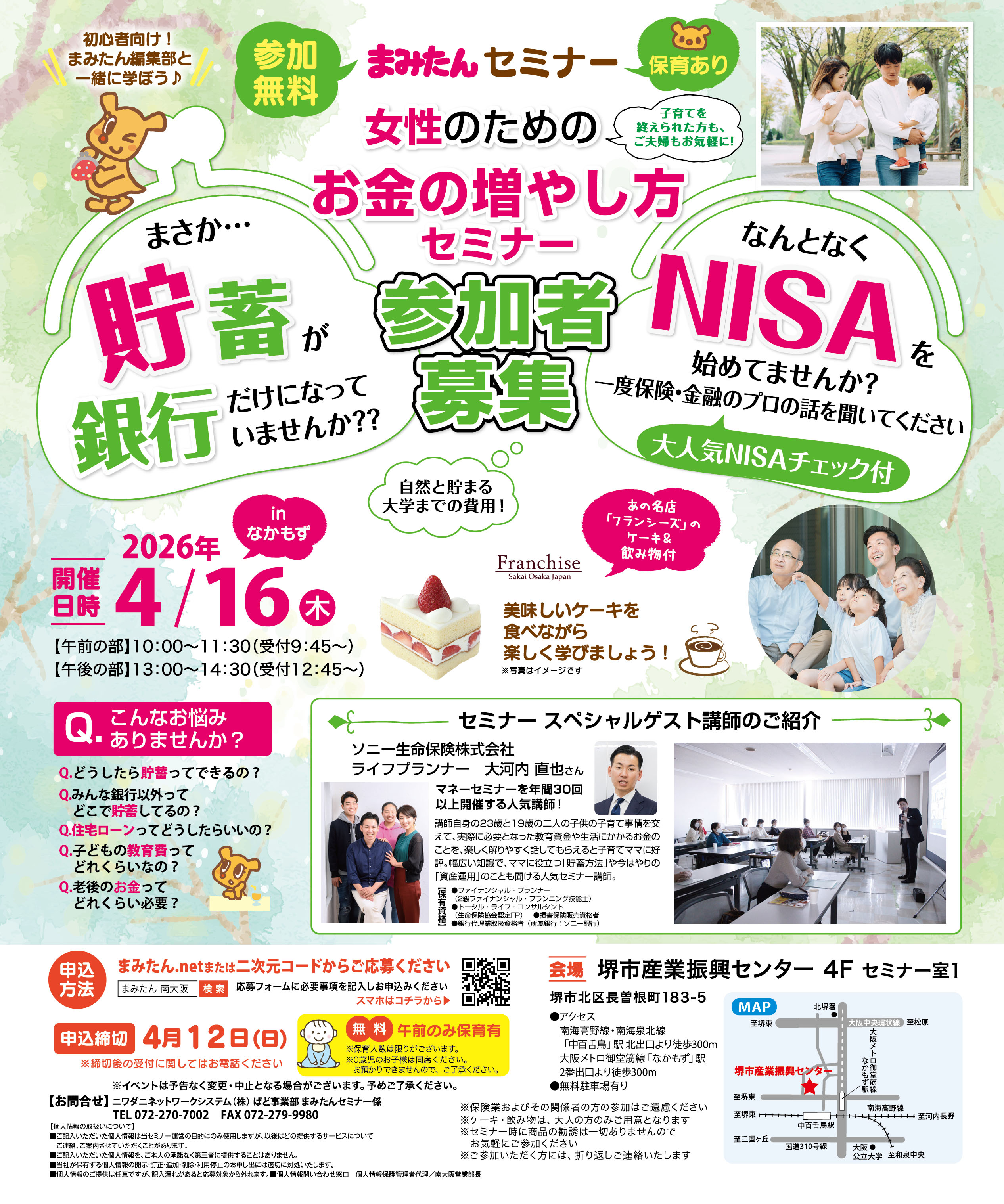 【4/16(木) 堺市北区】女性のためのお金の増やし方セミナー!☆ケーキ&飲み物付