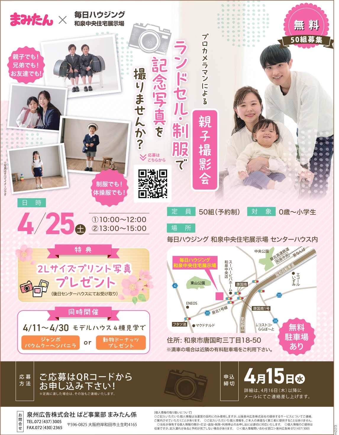 【50組様限定】入園・入学の記念に!「毎日ハウジング 和泉中央住宅展示場」でプロカメラマンによる無料の親子撮影会が開催されるよ♪