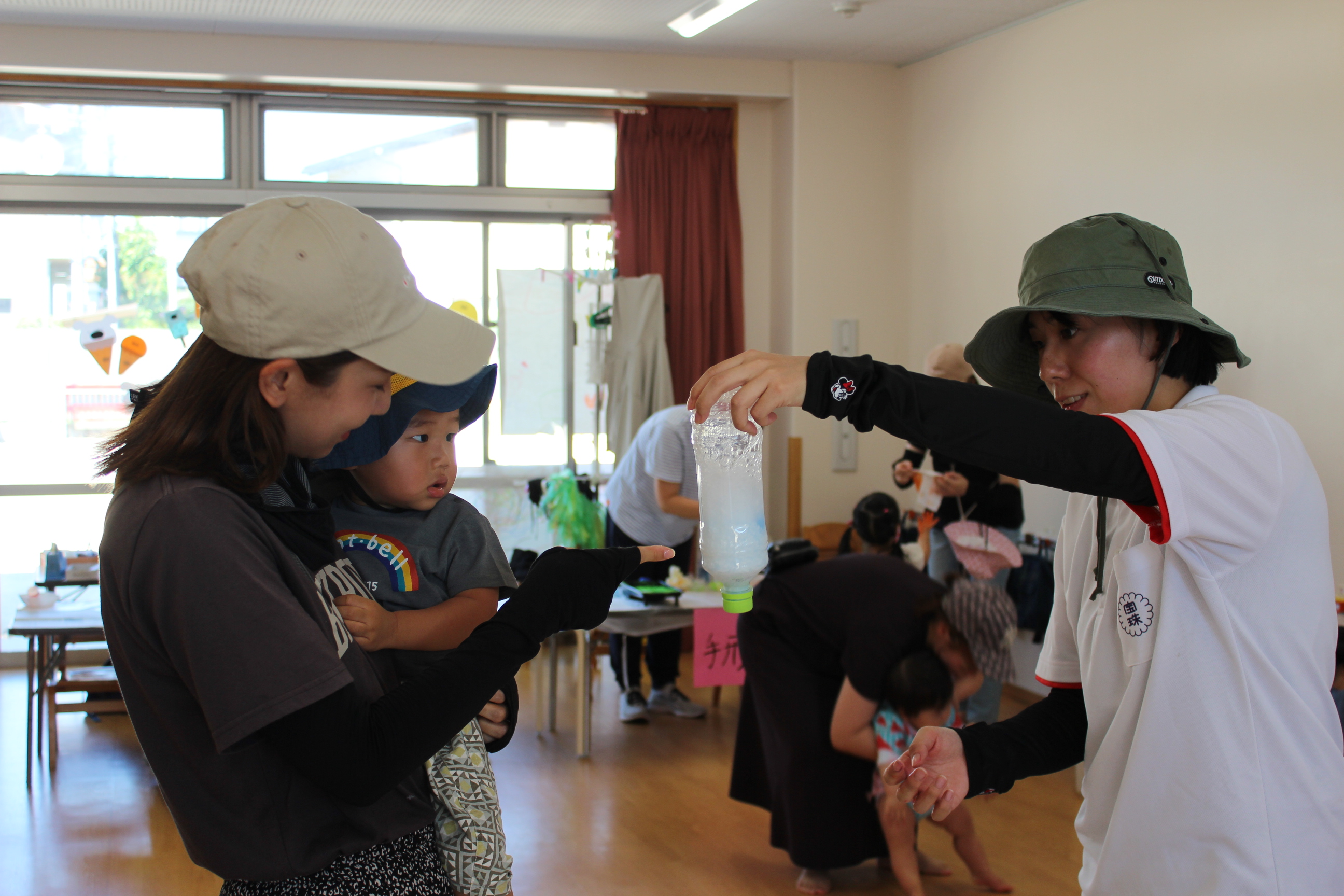 地域のお友達約19名が参加し、泡あそびや色水あそびなど、おうちではなかなか体験できない水遊びを楽しみました。はじめての泡の感触にびっくりしたり、色が混ざる様子を不思議そうに見つめたりー子どもたちの笑顔と歓声が園庭いっぱいに広がりました。