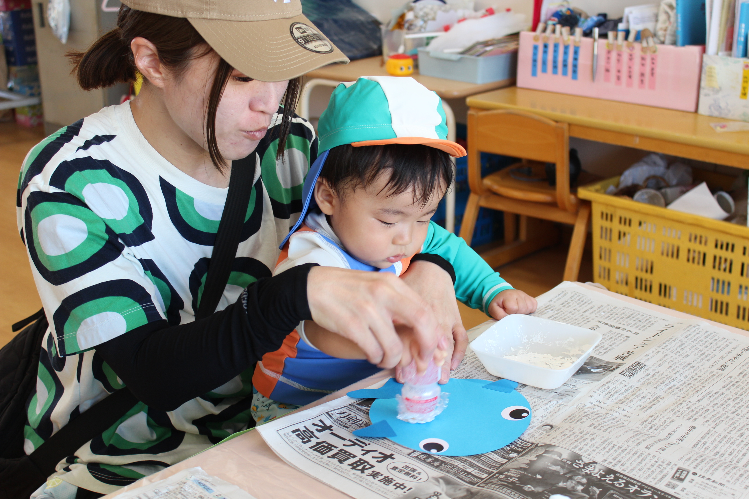 イベントの最後には、お子さまの手型をとってオリジナルうちわを作成。「かわいい!」「記念に残せてうれしい」と保護者の方々にもご好評でした。どんどん大きくなっていく手のひらの『今』を形に残す、特別な思い出となりました。「家庭ではできない遊びが体験できてよかった」「泡あそびが楽しかったようで、ずっと笑顔でした」「手型をとってくれるのはうれしいサービス!」とたくさんのうれしいお声をいただきました。その後は、園からの参加賞として手作りジンベエザメうちわをプレゼント。地域の皆様、ご参加ありがとうございました!次回のご来場も心よりお待ちしております。