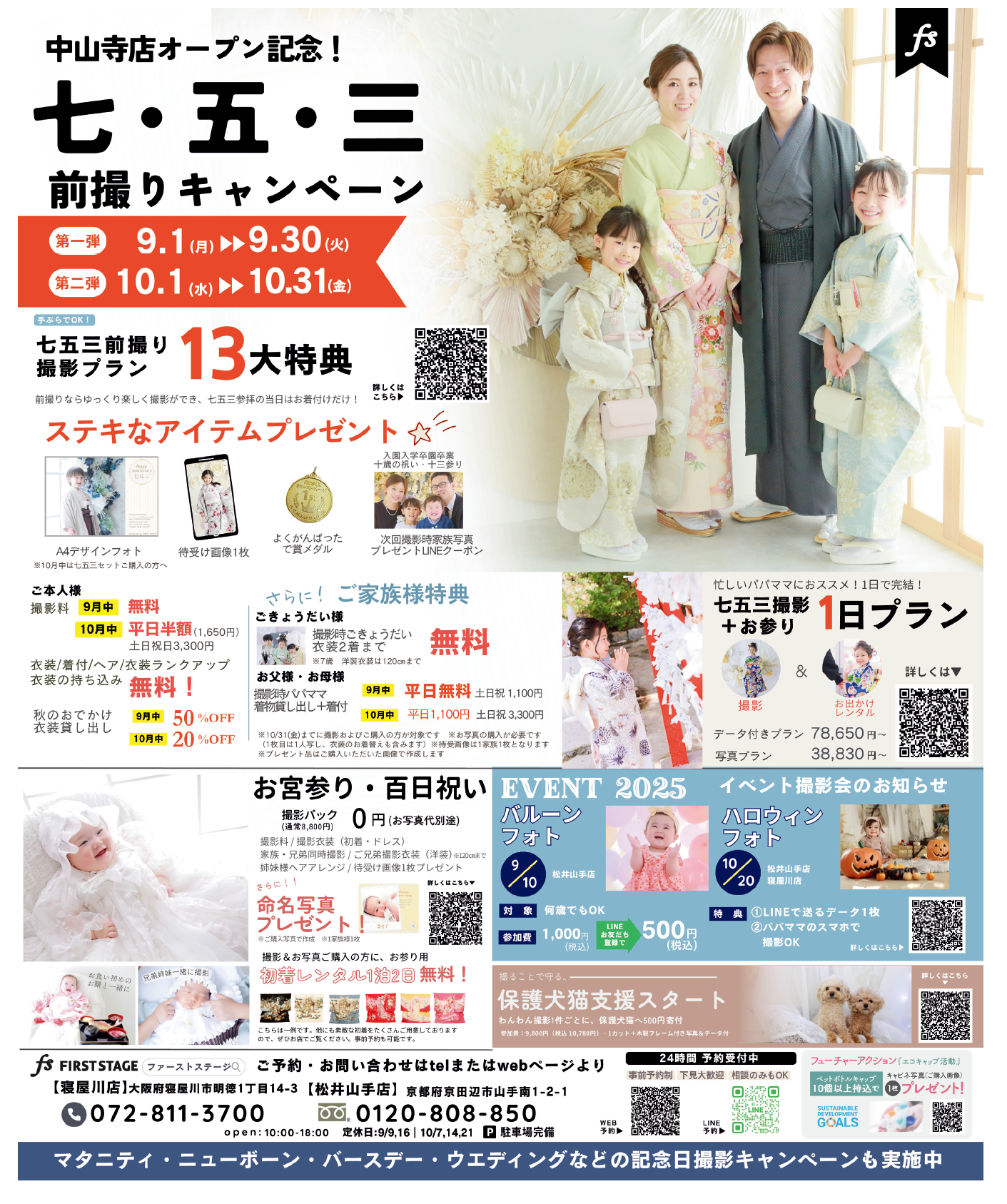 2025.9.10 【ファーストステージ松井山手・寝屋川店】七五三前撮りキャンペーン シェア ツイート お気に入り追加 0 中山寺店オープン記念!七五三前撮りキャンペーン ご予約・お問い合わせはtelまたはwebページより! ファーストステージ松井山店 ☎0120-808-850 ファーストステージ寝屋川店 ☎072-811-3700 WEB予約 HPはこちら 子供の成長を祝おう!七五三特集TOP 6 件 シェア ツイート お気に入り追加 0 関連記事 2025.09.10 家族の絆を彩る特別な1日を過ごそう|七五三で素敵な思い出づくり まみたん編集部 2025.09.10 家族の絆を彩る特別な1日を過ごそう|七五三の衣装 まみたん編集部 2019.11.03 必要以上に 不安に ならないで!「小1の壁」を 乗り越えるために|ともに育つ・育む まみたん編集部 2019.10.07 子どもらしく自然体で撮れる!|写真撮影のコツ&ワザ まみたん編集部 2019.03.06 不安も前向きに受けとめよう!小学校入学アドバイス|ともに育つ・育む まみたん編集部