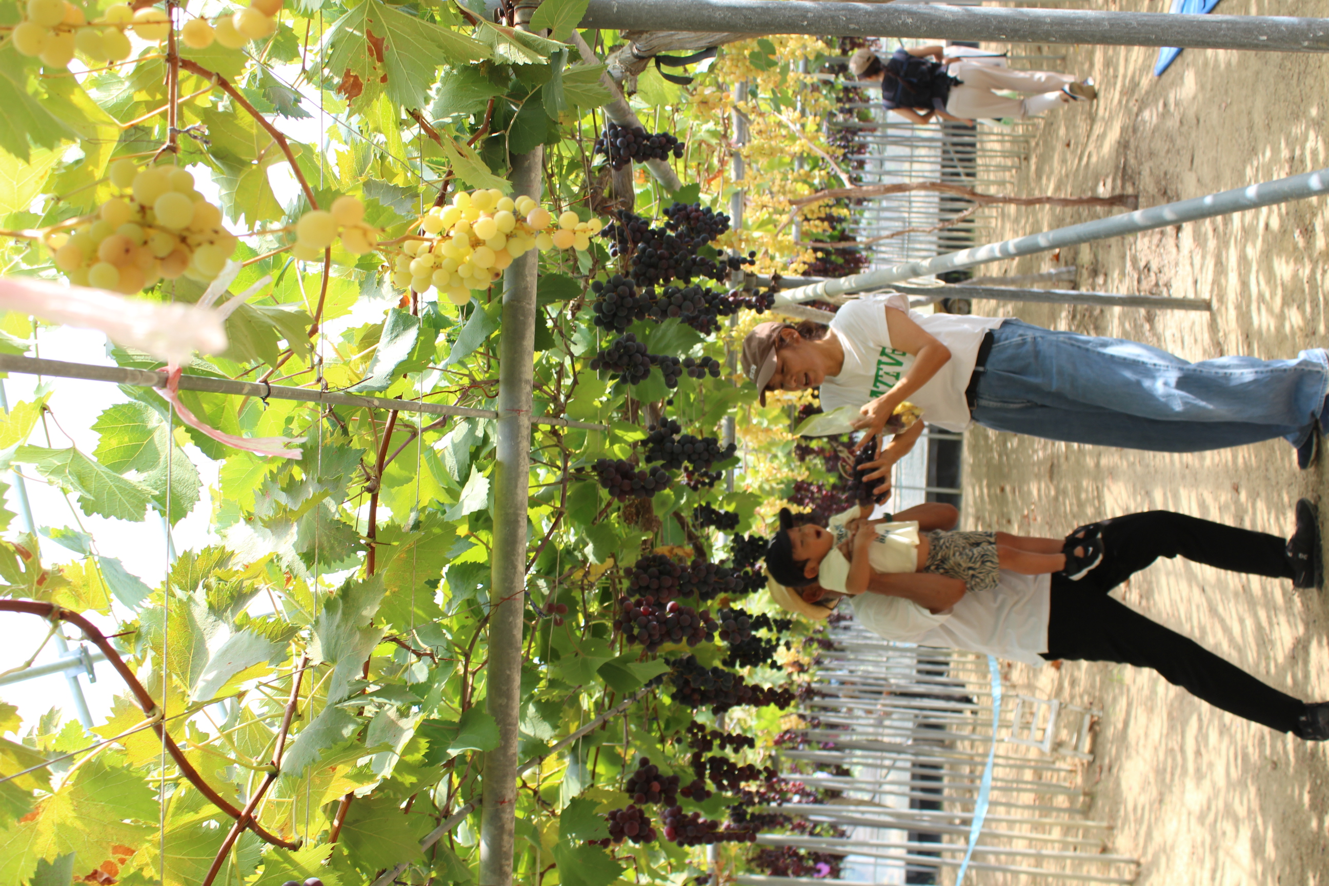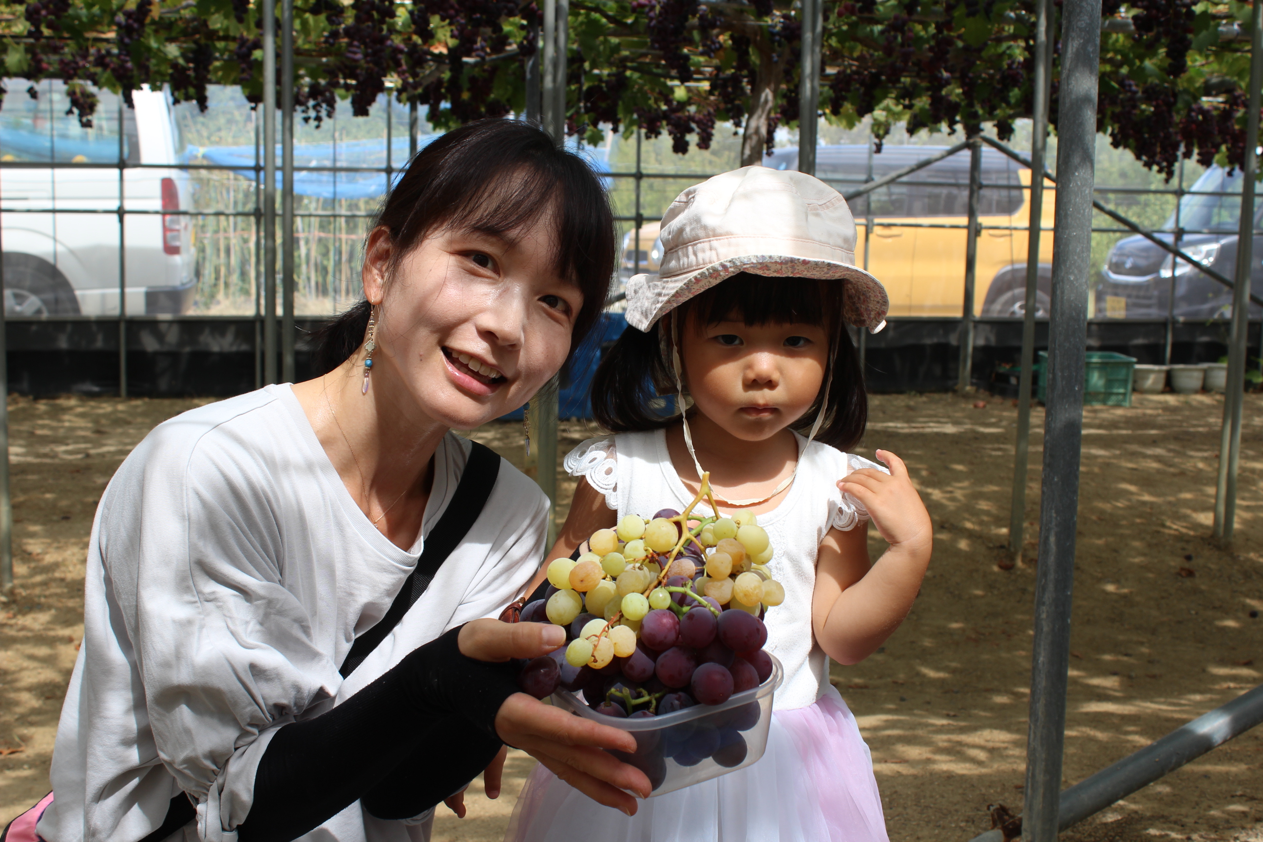 抱っこしてもらいながら、大きくて濃い色のぶどうを探して頑張る子どもたち。なかなかうまく狩れない様子もありましたが、ぶどうが採れた瞬間の笑顔は本当に格別でした! 採れたぶどうをうれしそうに持って走る姿もたくさん見られました。