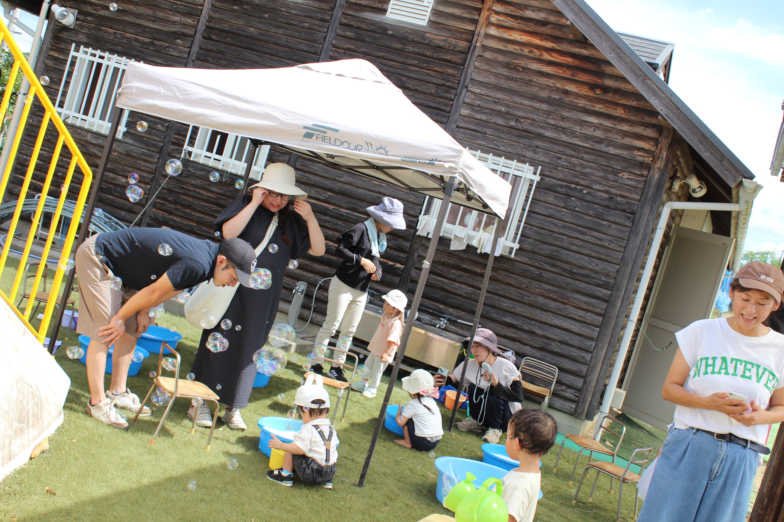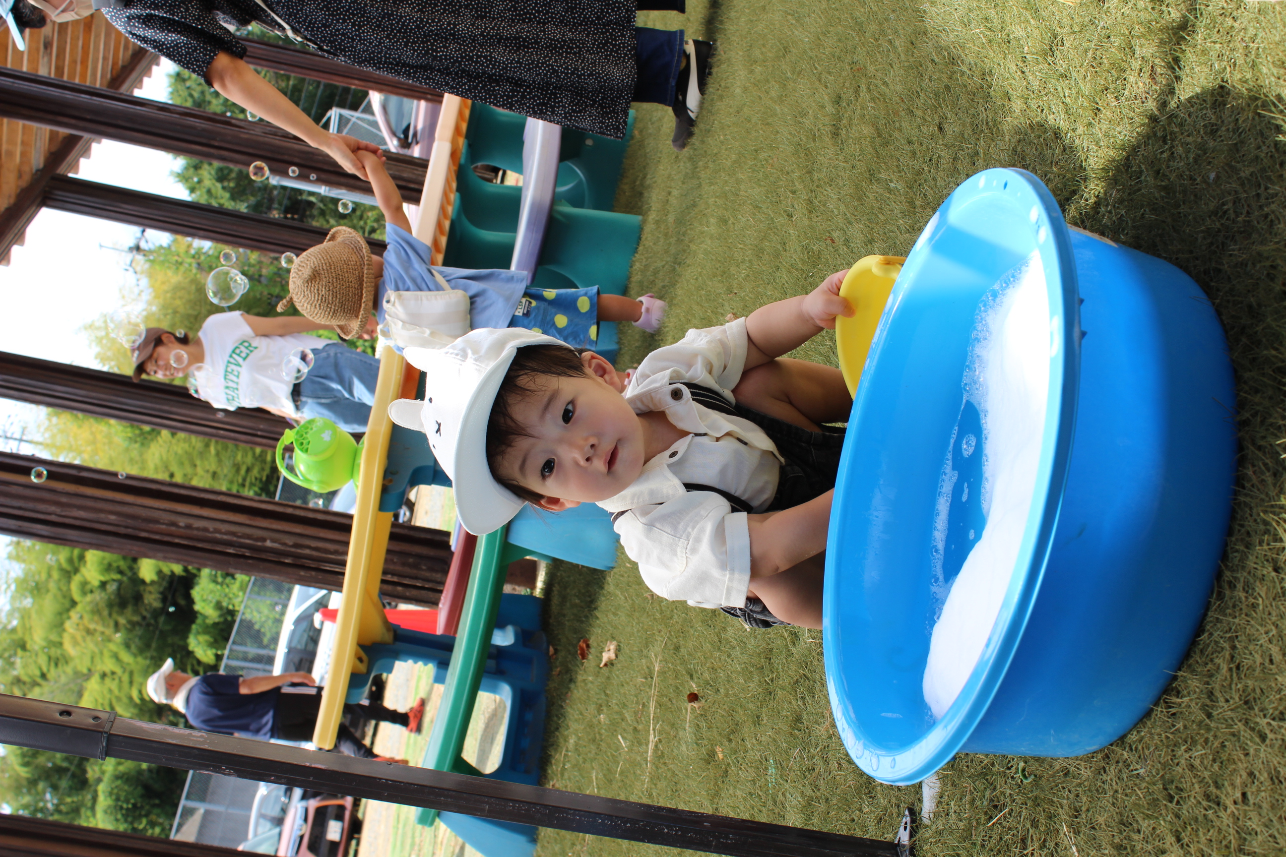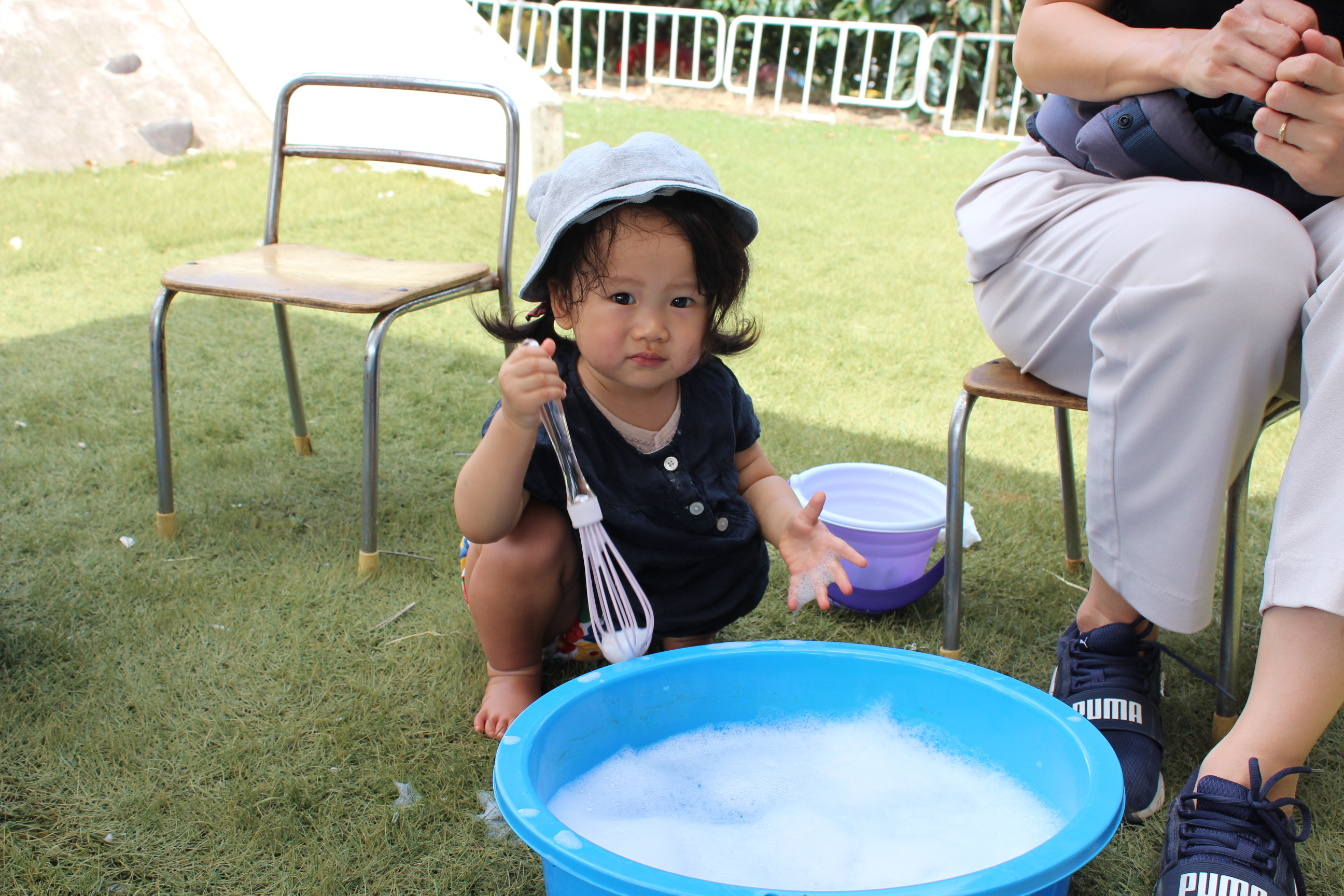 その後は、暑さをしのぎながら『あわ遊び』へ。手を洗ったり、布をしぼったり干したりして涼みながら楽しめるひとときに。