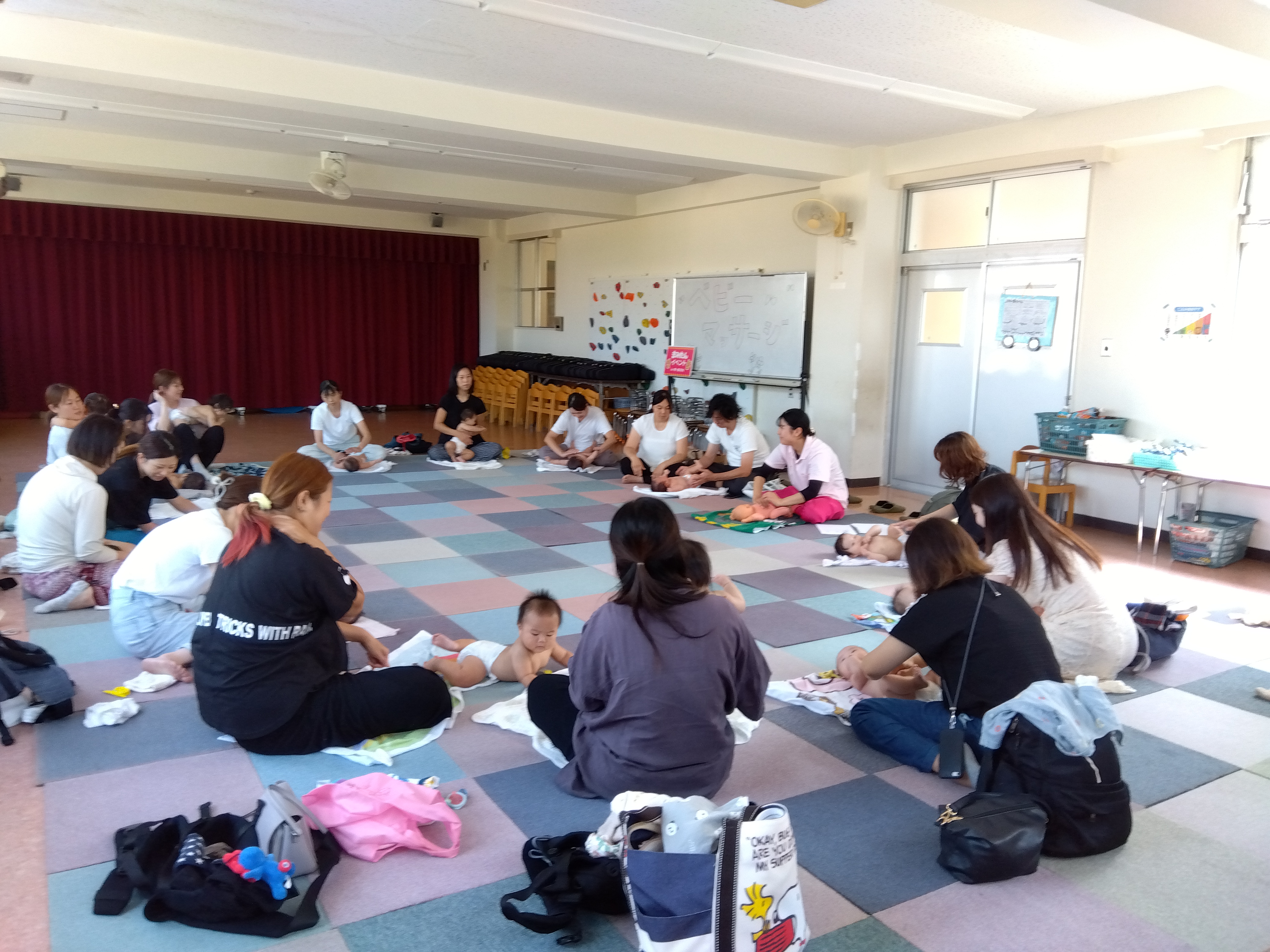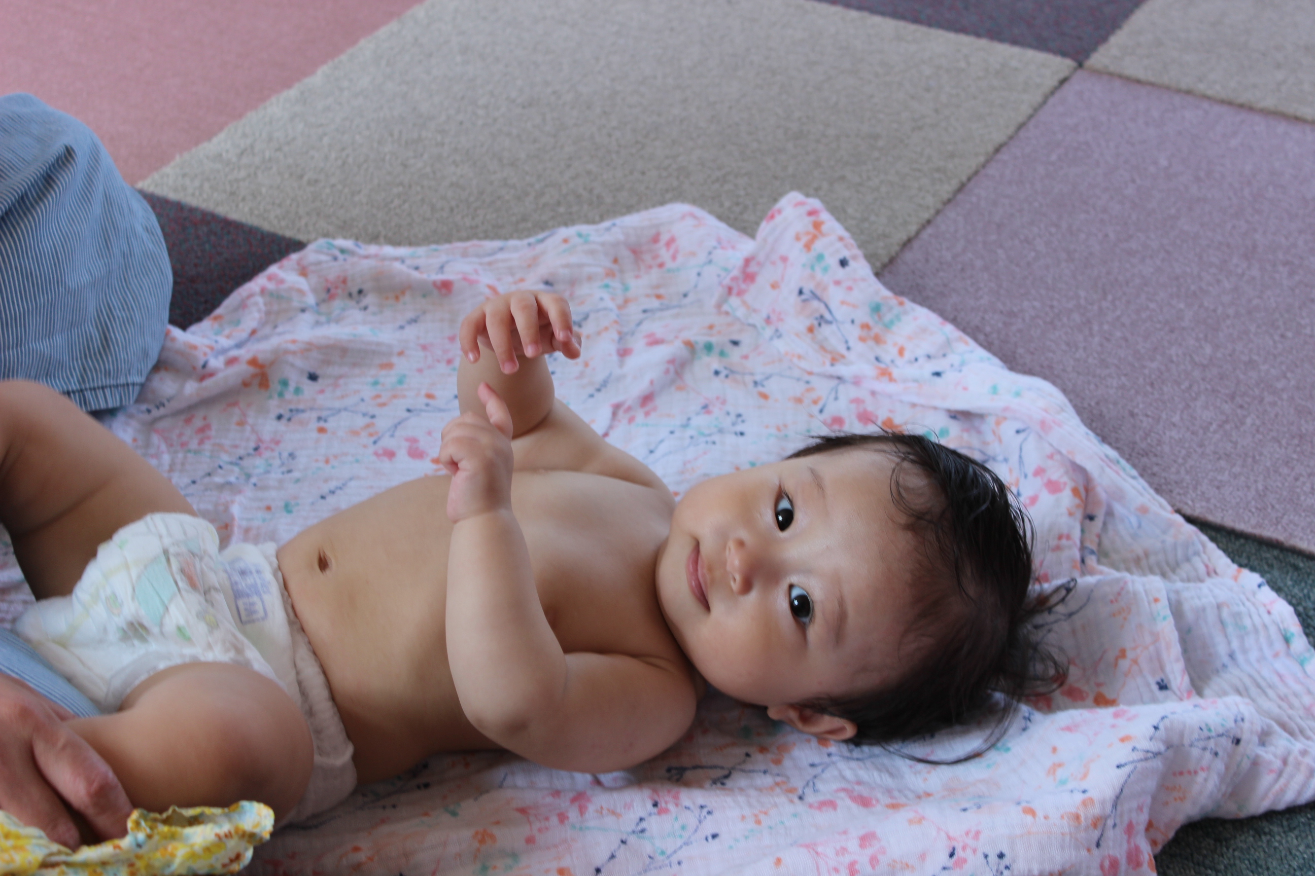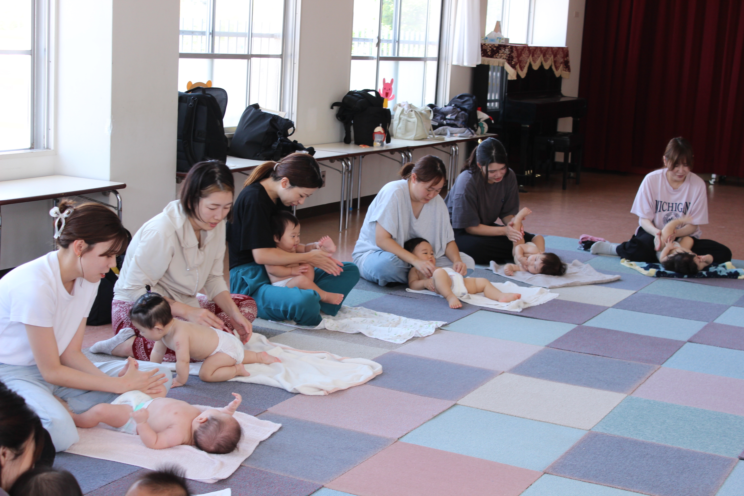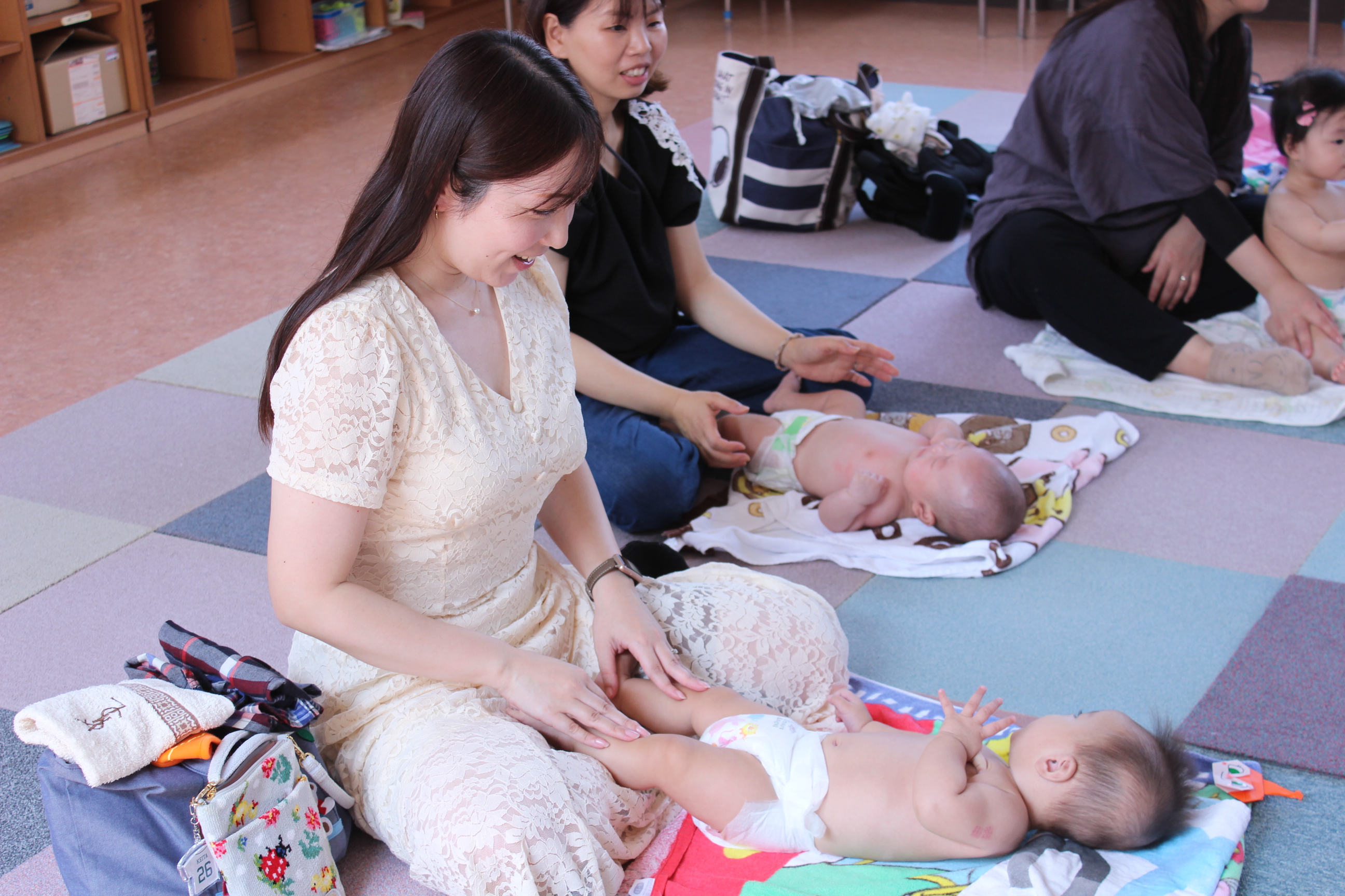 園長先生のご挨拶の後、園の先生による『ベビーマッサージ』。「お子さまに優しく声掛けをしながら進めてください」とのアドバイスを受け、ゆったりとしたお歌に包まれながら、ゆっくりと足・手・お腹・そして全身へ、手のぬくもりを伝えるようにマッサージしました。体験途中に気持ちよくて眠ってしまうお子さまもいらっしゃいました。先生からは「おうちでもママの優しいお声掛けで、できるだけ同じ時間に、テレビ・携帯は触らずに進めてください。オイルは使っても使わなくても大丈夫」とのアドバイスをいただきました。皆さん穏やかな時間を過ごすことができました。ありがとうございました。