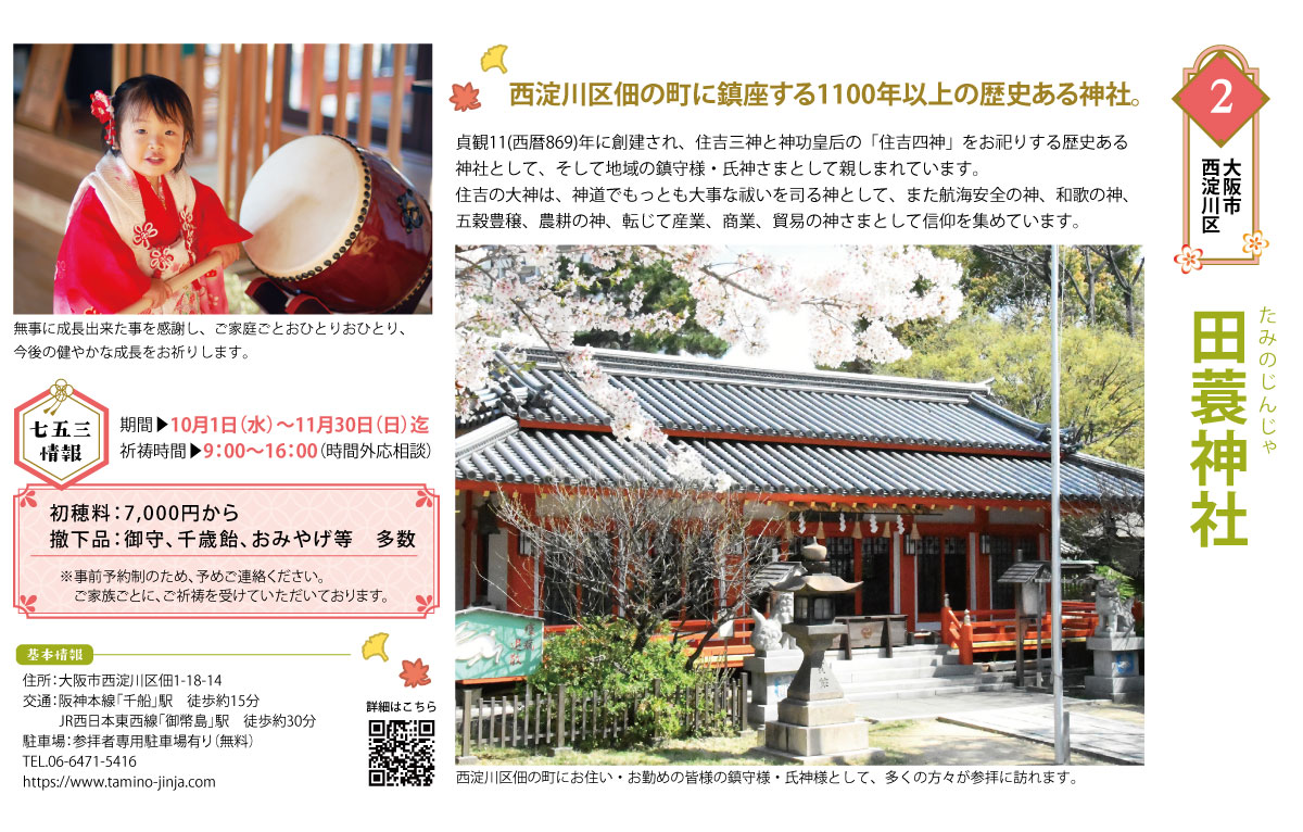2025.9.10 西淀川区佃の町に鎮座する1100年以上の歴史ある神社。【田蓑神社】 シェア ツイート お気に入り追加 0 貞観11(西暦869)年に創建され、住吉三神と神功皇后の「住吉四神」をお祀りする歴史ある 神社として、そして地域の鎮守様・氏神さまとして親しまれています。 住吉の大神は、神道でもっとも大事な祓いを司る神として、また航海安全の神、和歌の神、 五穀豊穣、農耕の神、転じて産業、商業、貿易の神さまとして信仰を集めています。 田蓑神社 田蓑神社|HP 子供の成長を祝おう!七五三特集TOP 5 件 シェア ツイート お気に入り追加 0 関連記事 2025.09.10 家族の絆を彩る特別な1日を過ごそう|七五三で素敵な思い出づくり まみたん編集部 2025.09.10 家族の絆を彩る特別な1日を過ごそう|七五三の衣装 まみたん編集部 2018.01.24 大阪市|ユニバーサル・スタジオ・ジャパン™(USJ) ベビーカーで行く、リアル事情【ママのクチコミ】 まみたん編集部 2018.01.24 大阪市|ユニバーサル・スタジオ・ジャパン™(USJ)子どもの食事&キッズメニュー、リアル事情【ママのクチコミ】 まみたん編集部 2018.01.31 大阪市|天王寺動物園 子供の食事&キッズメニュー、リアル事情【ママのクチコミ】 まみたん編集部