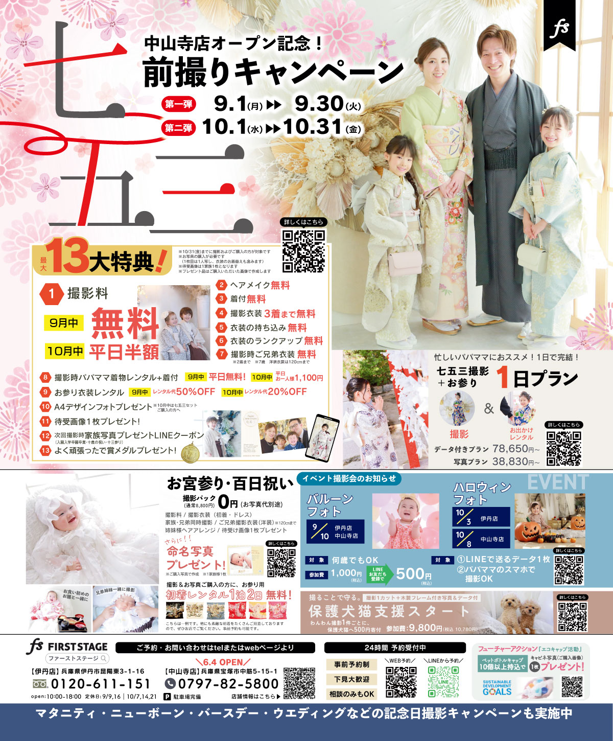 2025.9.10 【ファーストステージ伊丹店・中山寺店】七五三前撮りキャンペーン シェア ツイート お気に入り追加 0 中山寺店オープン記念!七五三前撮りキャンペーン ご予約・お問い合わせはtelまたはwebページより! ファーストステージ伊丹店 ☎0120-611-151 ファーストステージ中山寺店 ☎0797-82-5800 WEB予約 HPはこちら 子供の成長を祝おう!七五三特集TOP 7 件 シェア ツイート お気に入り追加 0 関連記事 2025.09.10 家族の絆を彩る特別な1日を過ごそう|七五三で素敵な思い出づくり まみたん編集部 2025.09.10 家族の絆を彩る特別な1日を過ごそう|七五三の衣装 まみたん編集部 2019.11.03 必要以上に 不安に ならないで!「小1の壁」を 乗り越えるために|ともに育つ・育む まみたん編集部 2019.10.07 子どもらしく自然体で撮れる!|写真撮影のコツ&ワザ まみたん編集部 2019.03.06 不安も前向きに受けとめよう!小学校入学アドバイス|ともに育つ・育む まみたん編集部