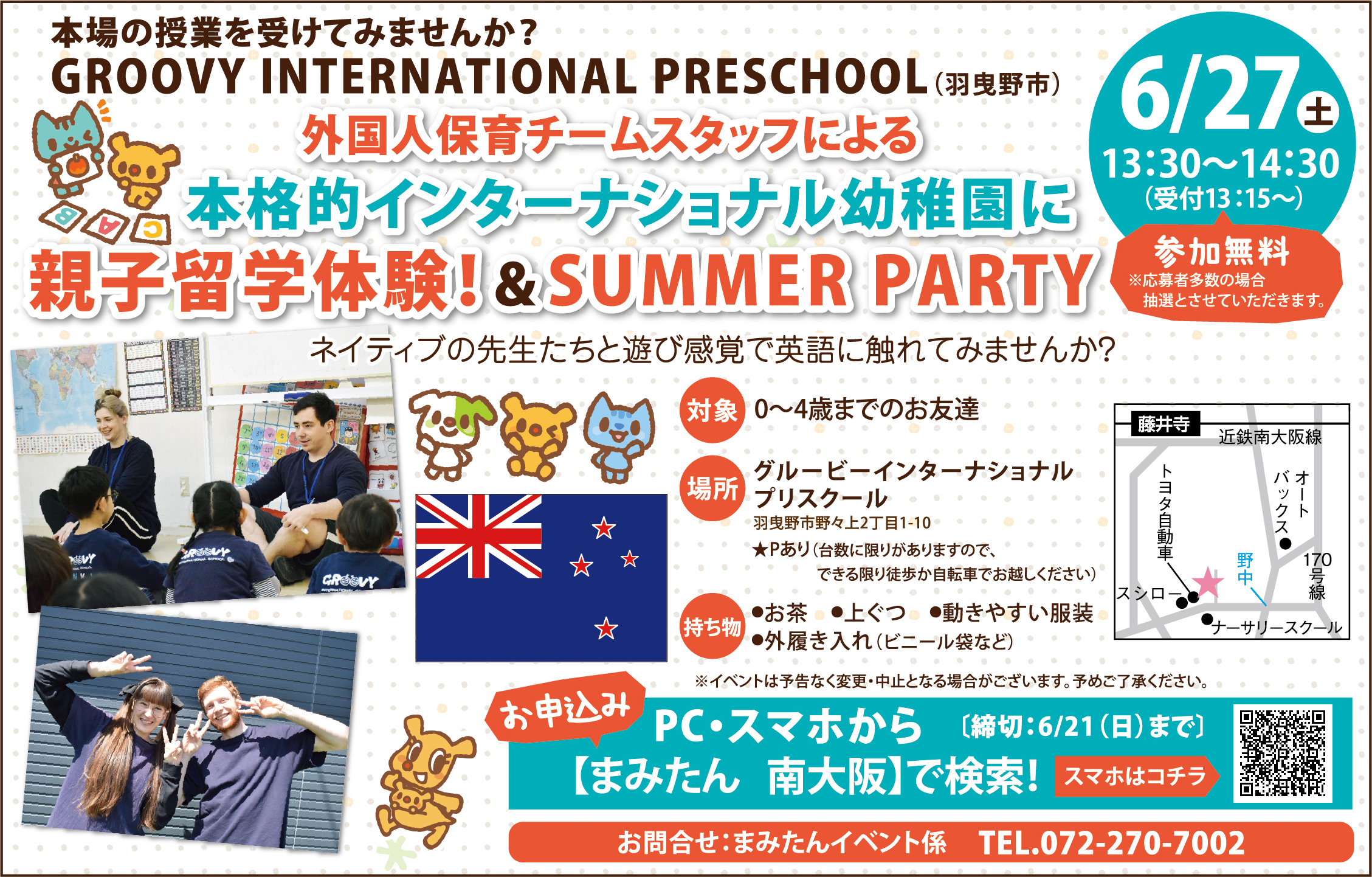 【6月27日(土)羽曳野市】GROOVY INTERNATIONAL PRESCHOOLイベント参加者募集◆親子留学体験!&SUMMER PARTY☆