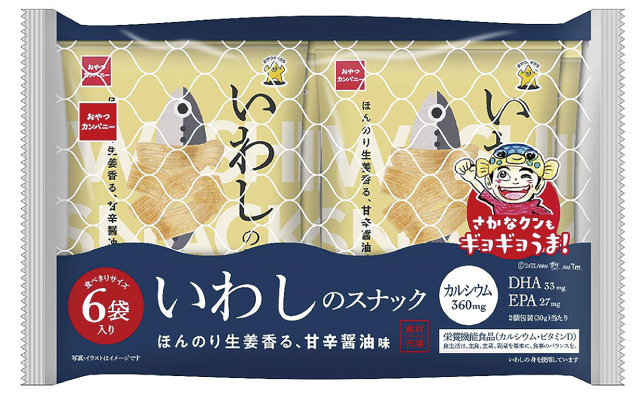 いわしがたっぷり入った、カリッサクッ食感のスナック菓子。いわしを生地に練り込み、ほんのり生姜の風味が香る甘辛い醤油味に仕上げました。お子様の成長を支えるカルシウムたっぷりのおやつとしてはもちろん、お酒が進む大人のおつまみにもぴったりな食べ切りサイズ6袋入り。