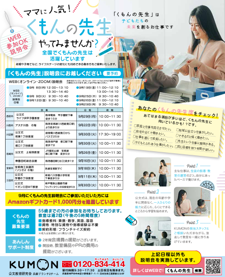 2025.9.9 【公文式】「くもんの先生」は 子どもたちの 未来を創るお仕事です シェア ツイート お気に入り追加 0 ママに人気!「くもんの先生やってみませんか?」 全国でくもんの先生は活躍しています 結婚や子育てなど、ライフステージの 変化にも対応できる働き方をご提案いたします。 HPはこちら! 公文教育研究会 兵庫ブランチ2チーム お電話はこちら 0120-834-414 7 件 シェア ツイート お気に入り追加 0 関連記事 2019.03.06 不安も前向きに受けとめよう!小学校入学アドバイス|ともに育つ・育む まみたん編集部 2018.02.14 キッズケータイ事情【2018年春・最新】入学直前!いつから持たせる?使い方のルールと、最新機種をチェックしよう まみたん編集部 2018.02.09 【離乳食レシピ】かぼちゃのチーズだんご まみたん編集部 2025.09.05 豊中市|子育てすくすく情報 (イベント情報)9月・10月 まみたん北摂編集部 2025.04.25 まみたん×I Love Piano 1ヵ月3回無料体験モニター募集 まみたん南大阪編集部