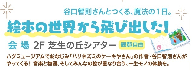 ハグミュージアムでおなじみ「ハリネズミのケーキやさん」の作者・谷口智則さんがやってくる!音楽と物語、そして絵が重なり合う、一生モノの体験を。