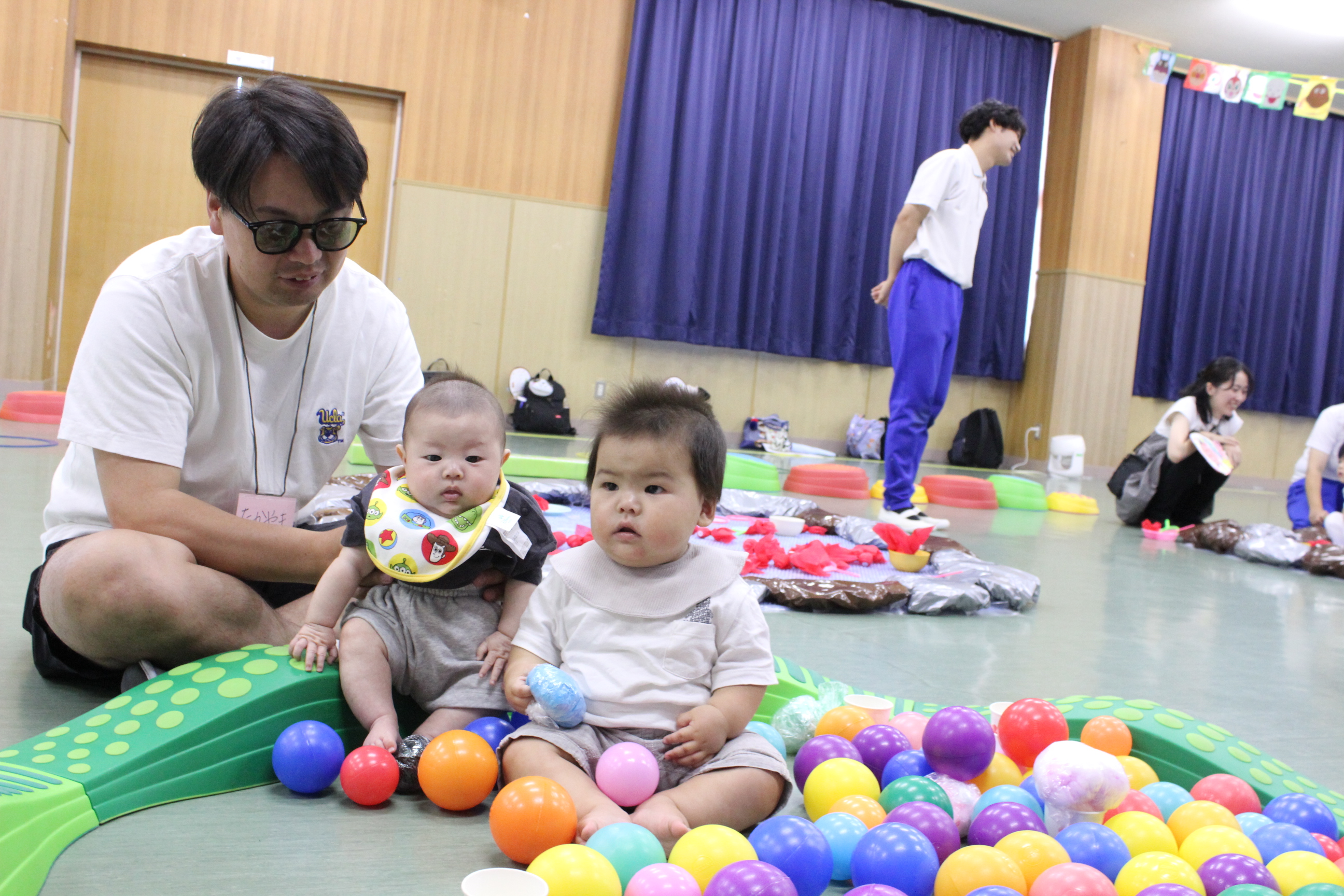 舞台では突然、人気キャラクターと仲間たちも登場して大盛り上がり!親子で『アンパンマン』の曲に合わせてふれあい遊びをしました。お母さんとリズムに合わせて楽しむ姿が印象的でした。今回は初めての2部構成、舞台でのショーも2回ありました。ショーの合間も、会場でボールプール・金魚すくい・輪投げ・マットなど、ご家族の方と一緒に自由に遊びました。