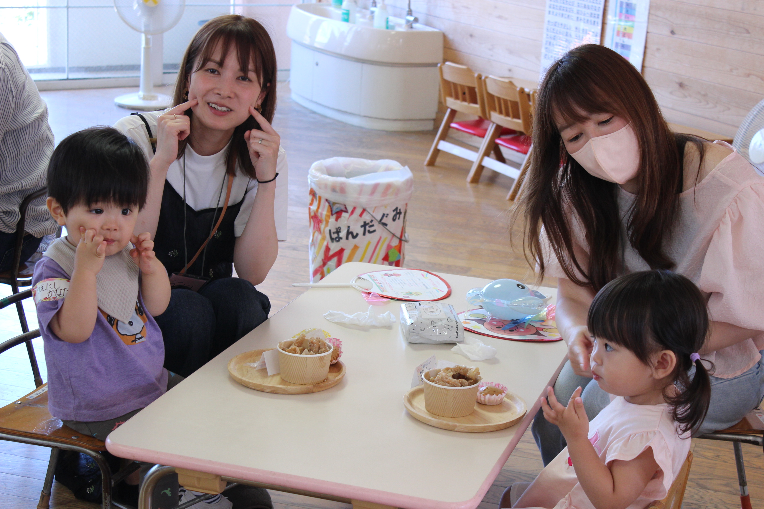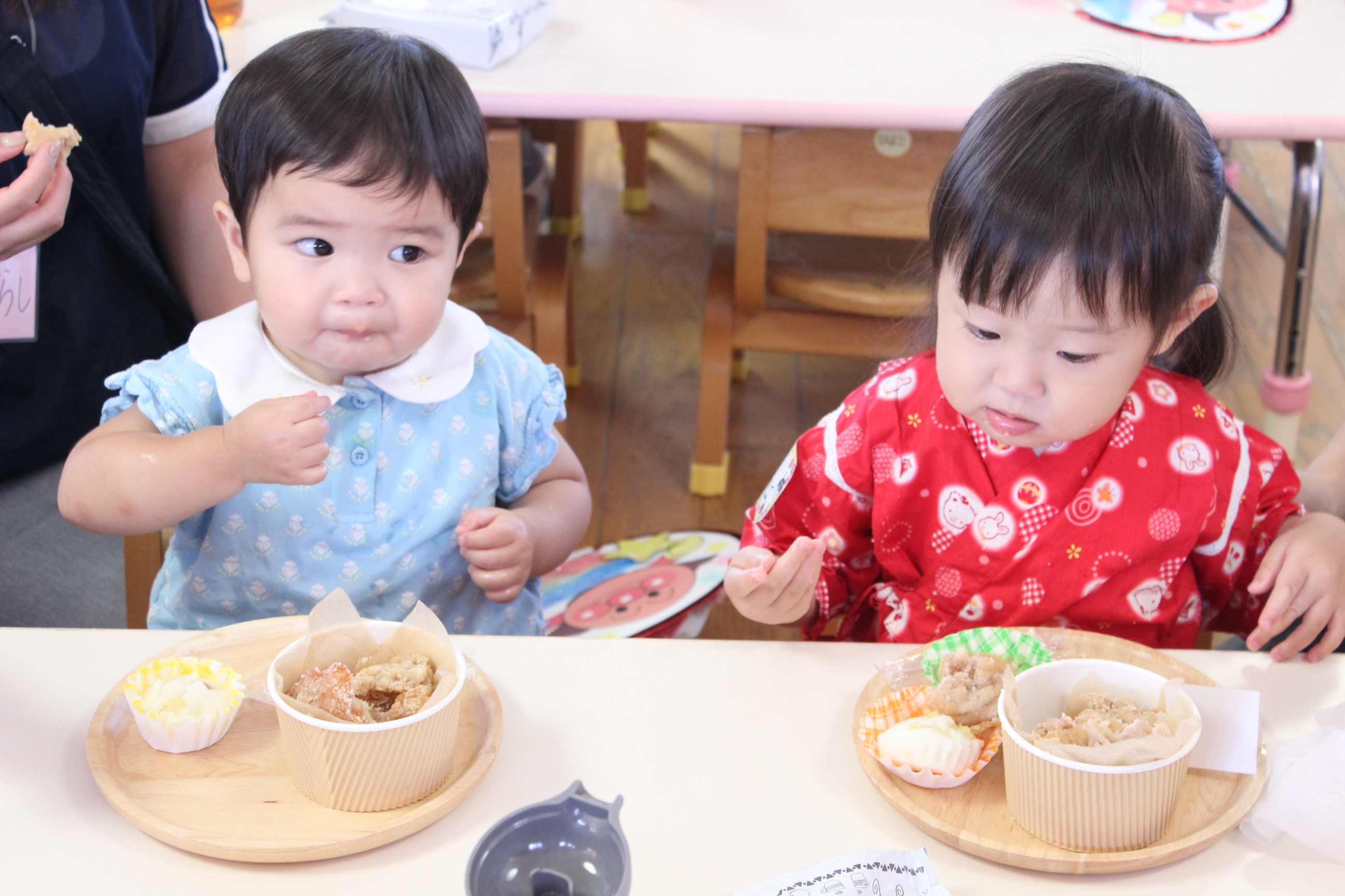 遊んだ後は、在園時に人気の給食の試食会があり、唐揚げや、2種類の蒸しパン、肉じゃがを親子でいただきました。手作りの給食はとてもおいしく、会場は自然と笑顔に包まれました。