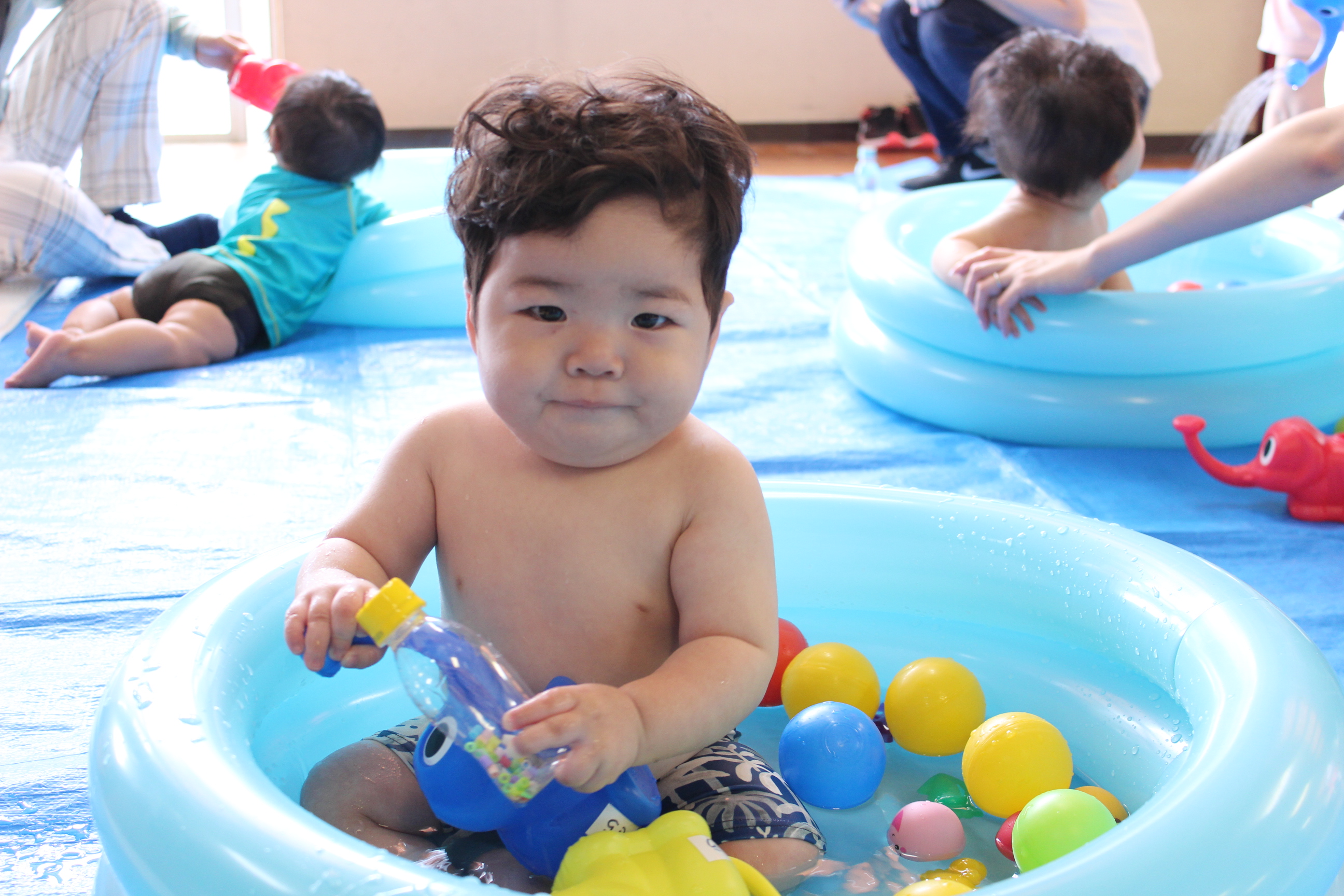 次に、お待ちかねの水遊び体験。クーラーの効いた室内で、保護者の方と一緒にダイナミックに楽しみました。ボールプールでは元気に泳いでいるお友達も!