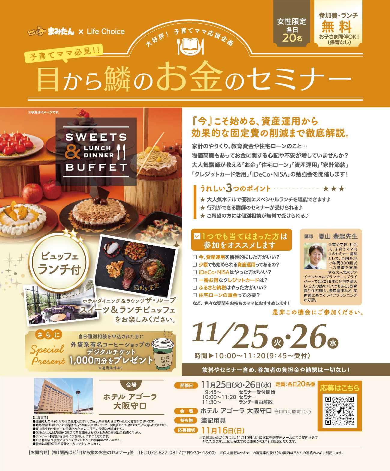 11/25(火)・26(水) 開催!子育てママ必見!!「目から鱗のお金のセミナー」(ランチ付・参加費無料)/ホテル アゴーラ 大阪守口