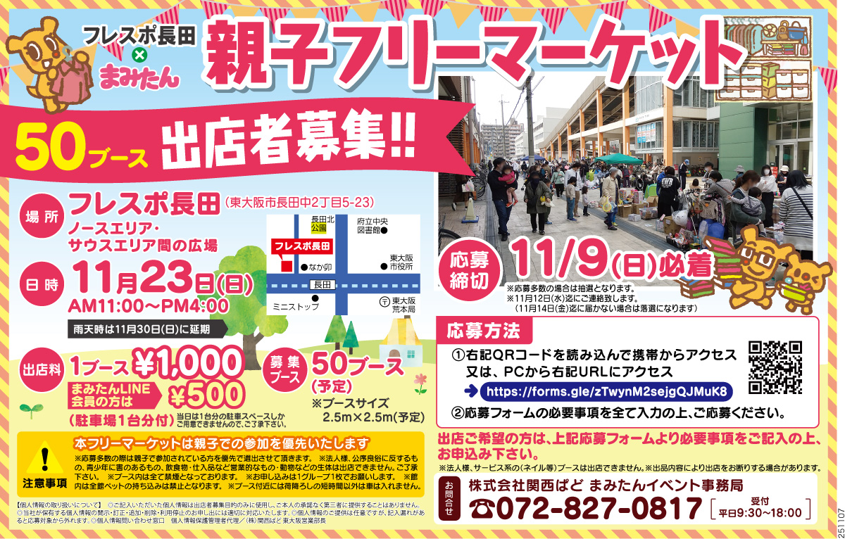 2025.10.31 11/23(日)開催【まみたん×フレスポ長田】フリーマーケット出店者募集! 11/23(日)の【まみたん×フレスポ長田】親子フリーマーケット ★約50ブース出店者募集!! 可愛い子供服や雑貨、おもちゃ、手作り作品などなどを販売して親子で楽しい一日を過ごしませんか☆ シェア ツイート お気に入り追加 0 ◆日時 11/23(日)11:00~16:00 ◆会場 フレスポ長田 ノースエリア・サウスエリア間の広場 東大阪市長田中2丁目5-23 ◆雨天の場合 11/30(日)に延期 ◆出店料 1ブース1000円 まみたん公式LINE会員の方は500円 (駐車場1台分付) 当日は1台分の駐車スペースしかご用意できませんのでご了承下さい。 ーーーーーーーーーーーーーーーーー 皆様のご応募お待ちしております^^ 【応募締切】11月9日(日) 詳細・応募はこちら 【お問合せ】 株式会社関西ぱど まみたんイベント事務局 TEL:072-827-0817(平日 9:30~18:00) 5 件 シェア ツイート お気に入り追加 0 この記事を書いた人 まみたん大阪東編集部 関連記事 2025.10.31 11/23(日)開催! まみたん×フレスポ長田『まみたん親子フリーマーケット』(入場無料) まみたん大阪東編集部 2025.10.31 【プレゼント|11月号】ノンアルコール飲料、ラーメンなど まみたん編集部 2024.07.01 YouTube「まみたんチャンネル」にて “ まみたんフェスタ ” 公開中! まみたん編集部 2024.09.19 ぱど・まみたんイベントなら「イベント倶楽部」 まみたん編集部 2022.09.06 「まみたん」とは?|O〜6歳児ママ・パパの子育てを応援!会員登録するとお得がいっぱい!会員限定プレゼントやイベントへのご招待、読者モデル体験などが楽しめます。 まみたん編集部