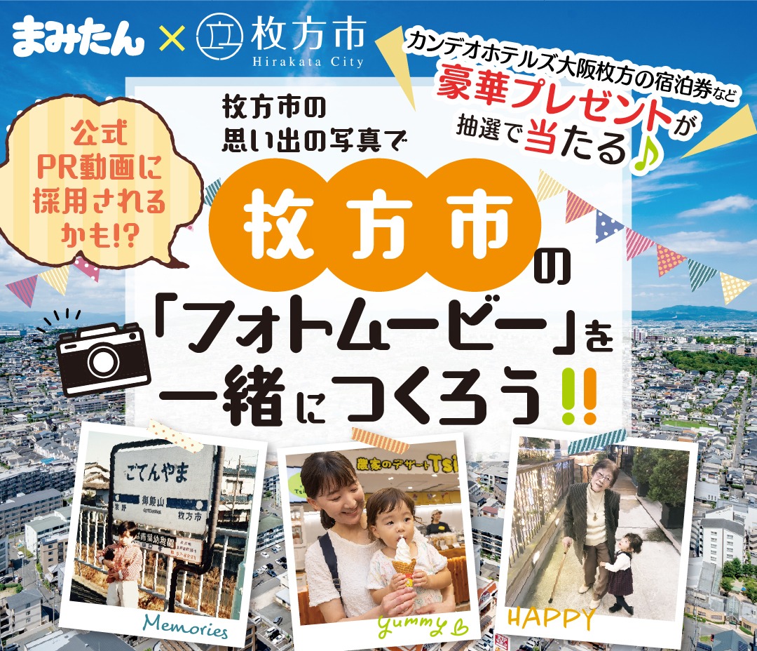 枚方市では、市内外のみなさんから「枚方の風景×人」をテーマにした写真を大募集! 昔懐かしい写真やスマホで撮った最新の1枚などみんなの写真を持ち寄って、枚方の魅力を詰め込んだ素敵なフォトムービーを作りませんか?