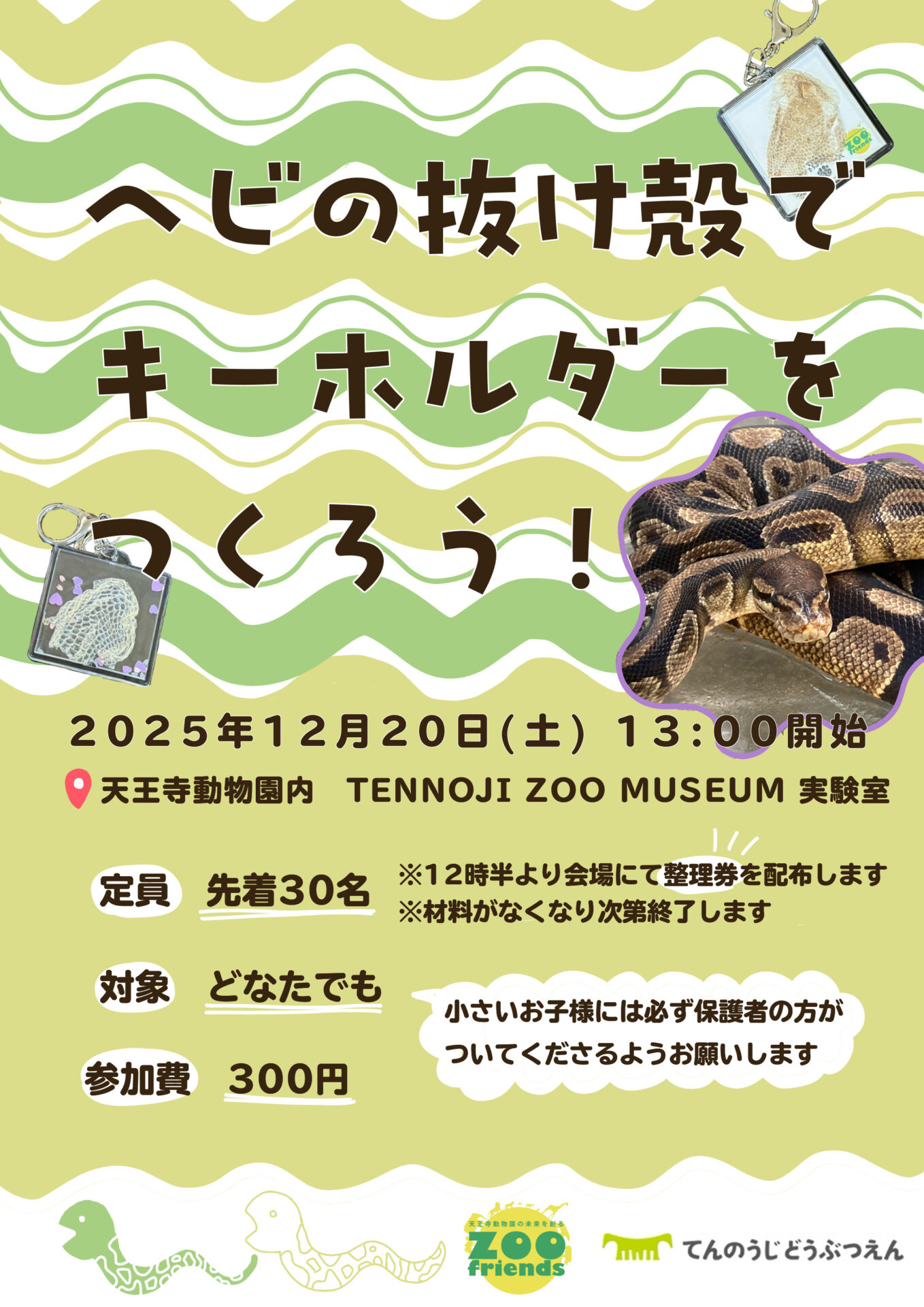 天王寺動物園では、巳年にちなんで、ボランティア団体の「zoo friends」による「ヘビの抜け殻でキーホルダーをつくろう!」を実施します。