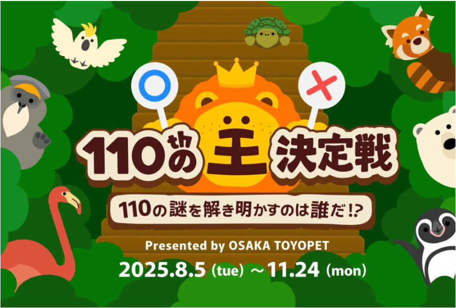 2025年、天王寺動物園は開園110周年。この節目の年に、110問のクイズというかつてない挑戦状。天王寺動物園は、大阪トヨペット株式会社(本社:大阪市西区立売堀3丁目1番1号)と連携し、動物と環境を楽しく学べる参加型キャンペーン「110の王決定戦」を2025年8月5日(火曜日)より開催します。