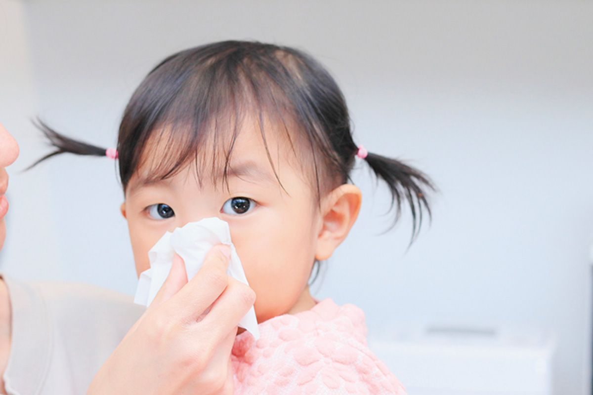 こまめに鼻を拭く、鼻吸い器を使うなど、日頃から鼻のケアをしておきましょう。かかった場合は、頭を少し高くして休ませ、鼻を強くかませすぎないように注意して。