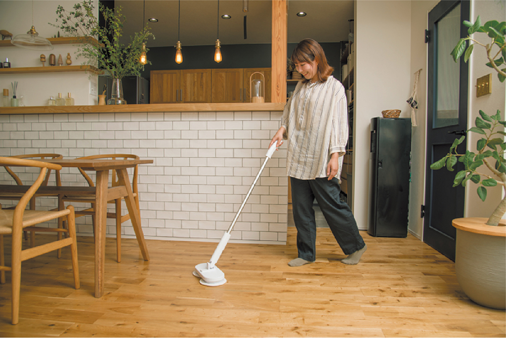 電動ツインヘッドが2つのモップパッドを回転。腰をかがめることなく立ったまま床の拭き掃除ができる。回転時に生み出す自走力を利用し、軽い力で床がピカピカに。防水性も備え、お風呂やベランダの掃除にも活用OK!