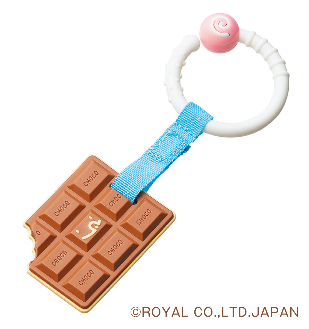 赤ちゃんがかみかみすると、ほどよい刺激を与えるチョコレートの形をした歯がため。おでかけに便利なリング付き。水洗いできるので衛生的なうえ、無塗装&ネジを使わない仕様なので、安心して使える。