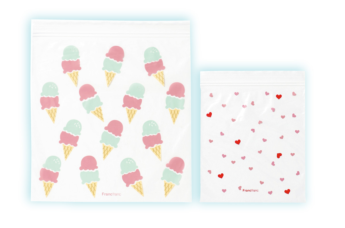 カラフルなアイス柄のLサイズ、赤いハート柄ちりばめたMサイズがセットになったジッパーバッグ。旅行時におむつや離乳食などを小分けにしたり、お菓子や小物を入れて友だちにプレゼントしたりするのにもピッタリ。