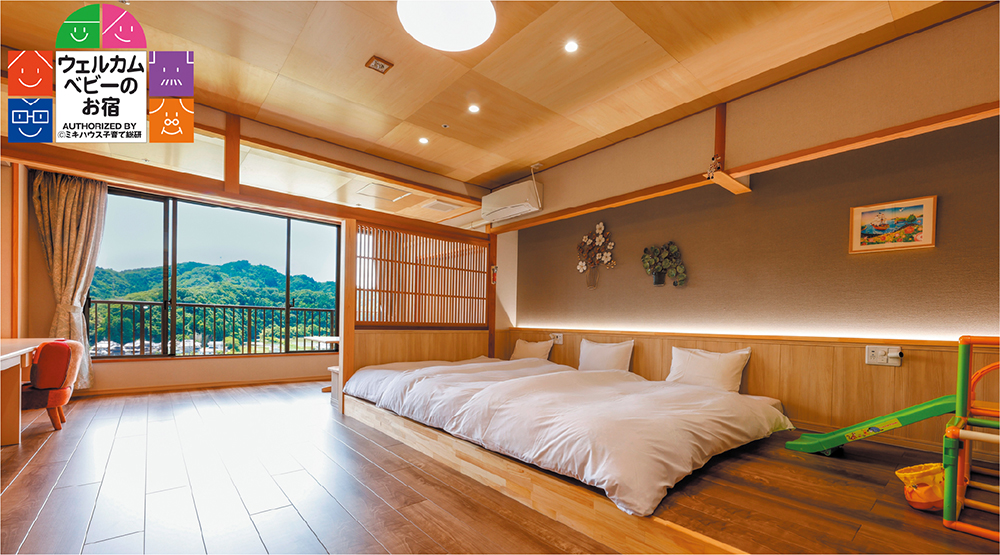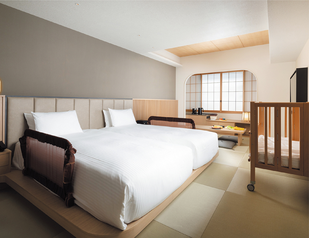 和洋室は段差がなく、転倒の心配が少ない安全設計。コンセントカバーやコーナーガードなど、細やかな配慮が行き届いた空間が広がる。ベビー用アイテムも充実しているので、小さな子どもとの旅も快適に過ごせること間違いなし!