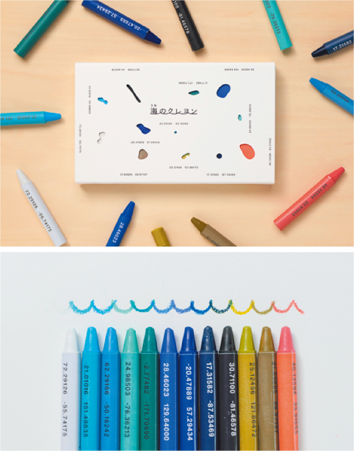 人工衛星から撮影した世界の海の色を再現した、スペシャルな12色のクレヨンセット。みつろうを中心とした天然素材を使用し、安全性にも配慮。売り上げの一部は海面上昇に直面するキリバス共和国へ寄付される。