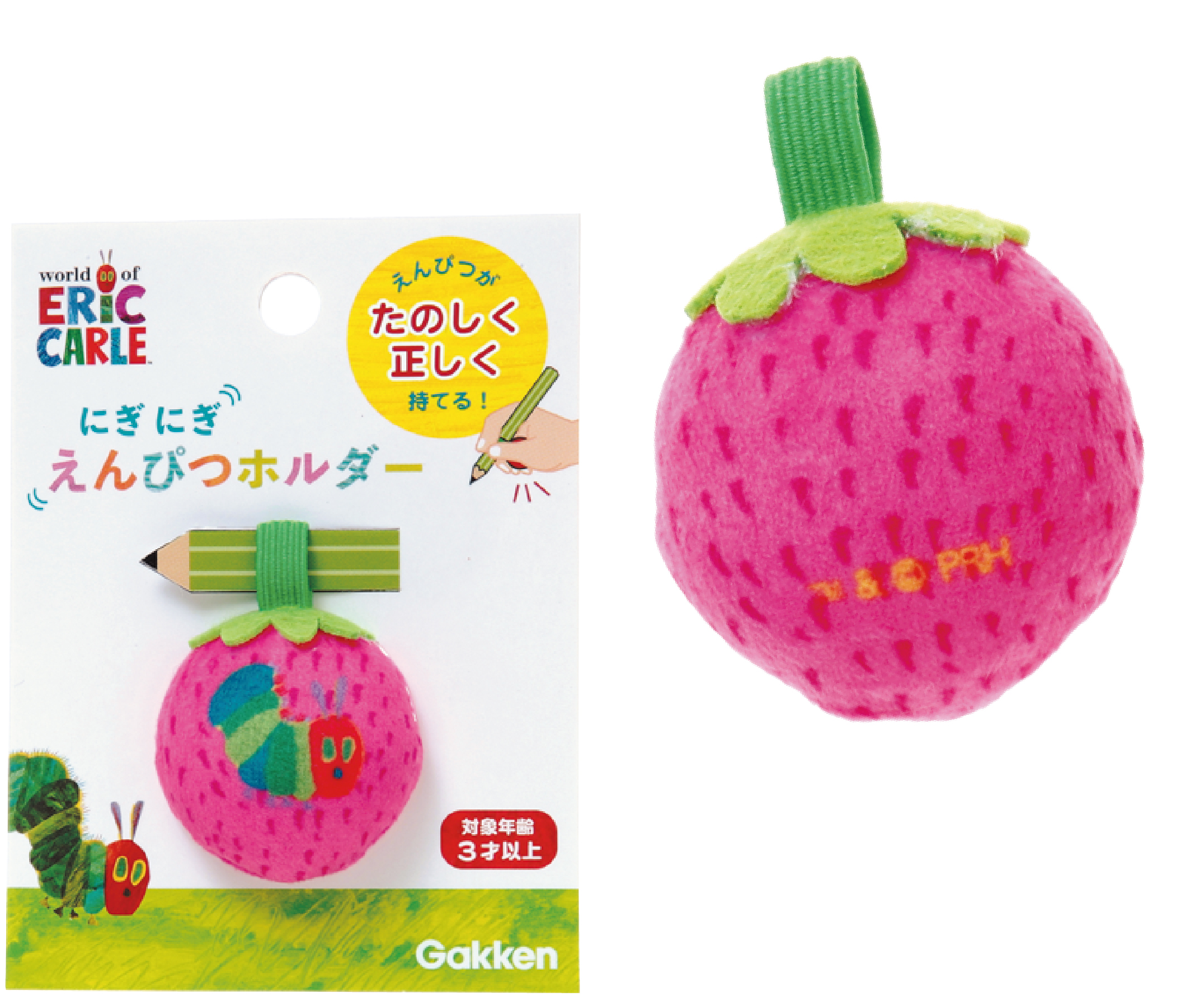 絵本「はらぺこあおむし」のあおむしと一緒に、ペンの握り方を楽しく練習できるえんぴつホルダー。ゴムをペンや鉛筆につけてやさしく握るだけでOK。手に余計な力を入れることなく正しく持てるように。