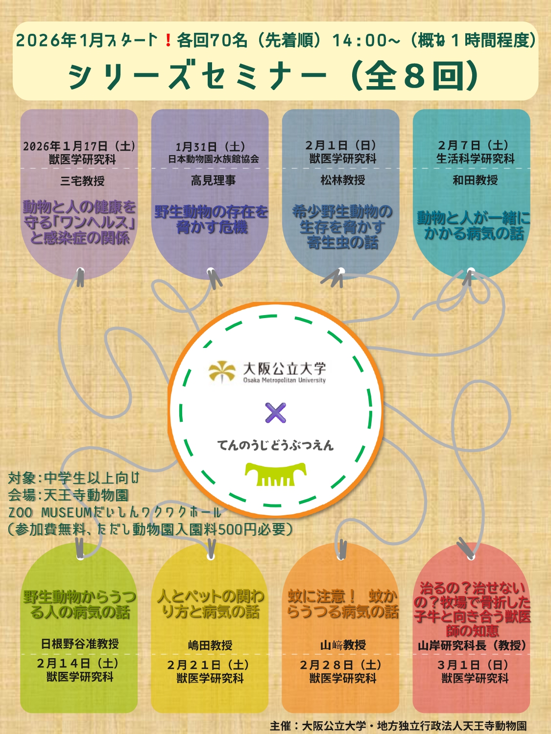 天王寺動物園と大阪公立大学(杉本キャンパス:大阪市住吉区杉本 3 丁目 3-138、りんくうキャンパス:泉佐野市りんくう往来北 1 番地の 58、学長:櫻木 弘之)は、連携協定に基づき、大阪公立大学の「都市シンクタンク」機能(OMU 都市シンクタンク機能)を活用し、私たちの身の回りに存在する自然や動物に潜むリスクを正しく理解し、安全で安心な暮らしに役立てることを目的としたシリーズセミナー「身近な自然や動物に潜む危険!?」 を開催いたします。