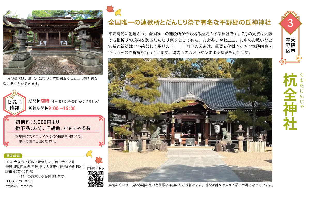 2025.9.10 全国唯一の連歌所とだんじり祭で有名な平野郷の氏神神社【杭全神社】 シェア ツイート お気に入り追加 0 平安時代に創建され、全国唯一の連歌所が今も残る歴史のある神社です。7月の夏祭は大阪でも指折りの規模を誇るだんじり祭りとして有名。お宮参りや七五三、お車のお祓いなど各種ご祈祷はご予約なしで承ります。11月中の週末は、重要文化財であるご本殿回廊内で七五三のご祈祷を行っています。境内でのカメラマンによる撮影も可能です。 杭全神社 杭全神社|HP 子供の成長を祝おう!七五三特集TOP 5 件 シェア ツイート お気に入り追加 0 関連記事 2025.09.10 家族の絆を彩る特別な1日を過ごそう|七五三で素敵な思い出づくり まみたん編集部 2025.09.10 家族の絆を彩る特別な1日を過ごそう|七五三の衣装 まみたん編集部 2018.01.24 大阪市|ユニバーサル・スタジオ・ジャパン™(USJ) ベビーカーで行く、リアル事情【ママのクチコミ】 まみたん編集部 2018.01.24 大阪市|ユニバーサル・スタジオ・ジャパン™(USJ)子どもの食事&キッズメニュー、リアル事情【ママのクチコミ】 まみたん編集部 2018.01.31 大阪市|天王寺動物園 子供の食事&キッズメニュー、リアル事情【ママのクチコミ】 まみたん編集部
