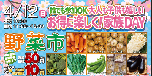 2026.3.6 大人も子供も嬉しい★お得に楽しく!家族DAY だれでも参加OKの大抽選会! シェア ツイート お気に入り追加 0 誰でも参加OK!大人も子供も嬉しい!お得の楽しく!家族DAY 野菜市 当日入会OK! 【開催日時】 4月12日(日) 受付10:30 開始 11:00~15:00 市場直送新鮮野菜 全種1つ 通常価格50円→会員様限定価格10円 ハズレなし!キッズ大抽選会 二等以下も盛りだくさん! ゲームコーナーでたくさん遊ぼう スーパーボールすくい、射的、サイコロ転がしがALL100円(税込)であそべちゃう! 七五三のご予約も受けたまっております★ お電話はこちら 06-6795-1171 13 件 シェア ツイート お気に入り追加 0 関連記事 2026.03.06 2026/3/28(土) 教育費も老後も安心!ママのための「新NISA」はじめてセミナー【無料保育付】 まみたん泉州編集部 2025.12.04 初心者向け!毎回大好評!2026/1/31(土)『新NISAの新常識』まみたんセミナー開催 まみたん泉州編集部 2025.08.05 健康と老後のリスクについて同時に学べる! 特別セミナー開催! まみたん泉州編集部 2025.08.04 4/15(火)『新NISAの新常識セミナー』まみたんコラボセミナー まみたん泉州編集部 2025.03.07 『新NISAの新常識セミナー』まみたんコラボセミナー まみたん泉州編集部