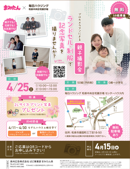 【50組様限定】入園・入学の記念に!「毎日ハウジング 和泉中央住宅展示場」でプロカメラマンによる無料の親子撮影会が開催されるよ♪