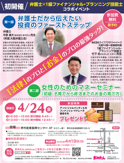 【4/24(金)堺市北区】 初開催!「法律」と「お金」のプロの最強タッグによるマネーセミナー